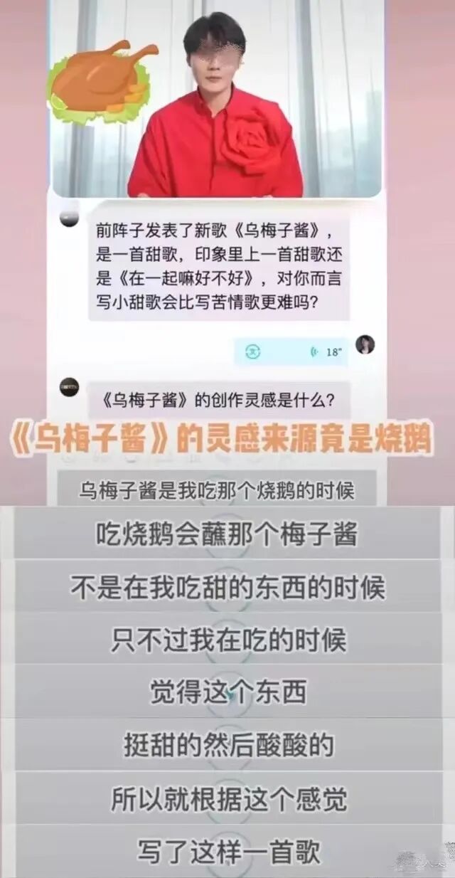 其实啊,人家是吃烧鹅写出来的。概括一下就是,李荣浩直言灵感就是来源于吃烧鹅,吃的时候会蘸一下梅子酱,觉得味道甜甜又有点酸酸的,然后就写出了这首歌。