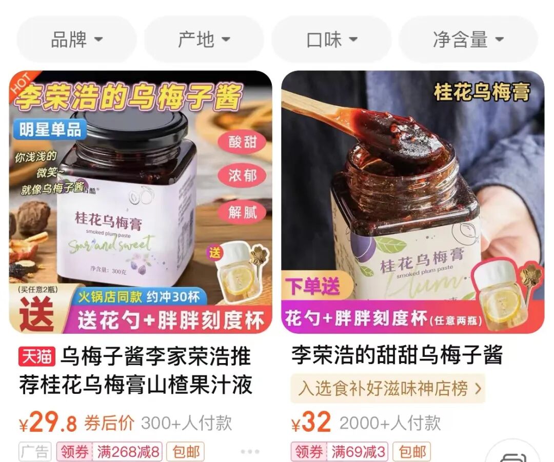 在这波热度下,乌梅子酱淘宝热搜指数一周上升了843%,可以看到不少店铺将自家的酱与李荣浩进行捆绑营销,“荣浩的甜甜”、乌梅子酱李荣浩推荐”、“浓缩的乌梅子酱,吃完甜甜地笑”,花式文案层出不穷,很多店铺的销量近期激增。
