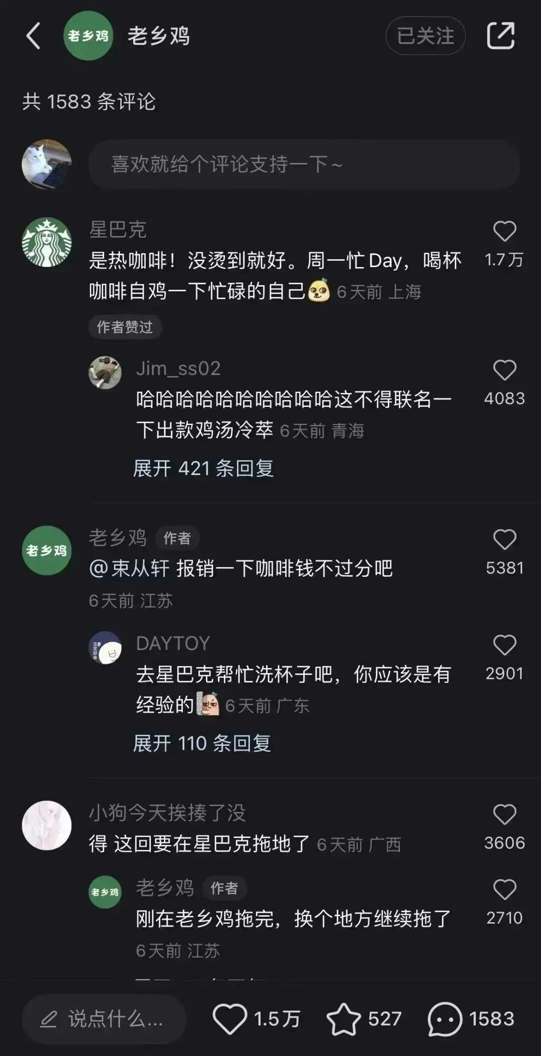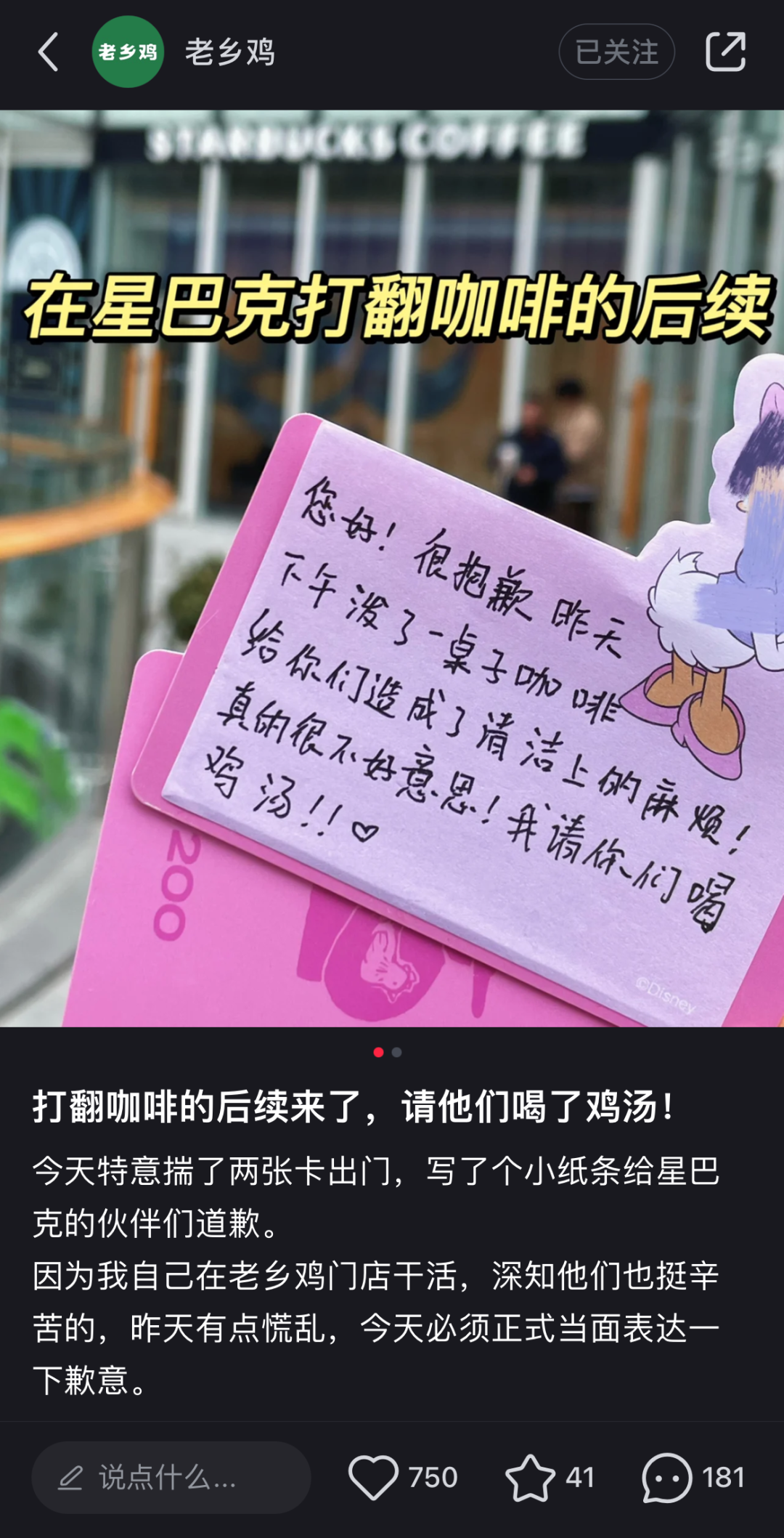 本想点一杯星巴克咖啡犒劳自己的老乡鸡,却失手将咖啡打翻,诚恳而又“心酸”的道歉引来了众多网友围观,星爸爸也急忙赶来安慰:“没烫到就好!”