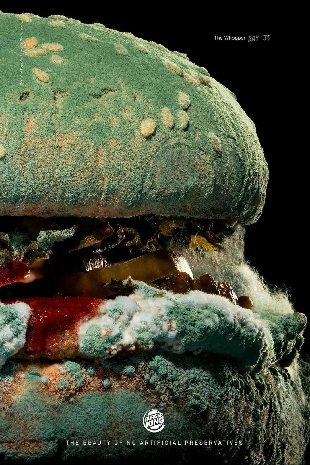 而“自黑”式营销并不全是暴露缺点,2020年汉堡王推出的发霉汉堡广告,则是欲扬先抑的代表。