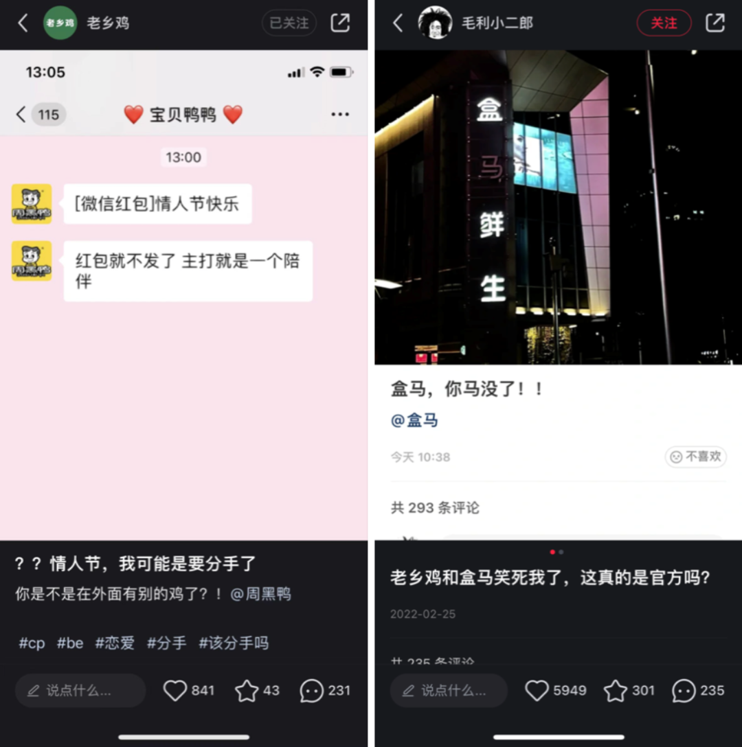 这样聪明的反“传统印象”营销自然也不止老乡鸡和瑞幸,作为玩梗造梗的一把好手,盒马在“不正经”的路上也越走越远。