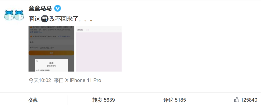 2021年12月,#盒马昵称改不回来#这一话题冲上微博热搜。本来为了庆祝双12,盒马官方账号将微博名改成“盒盒马马”,谁知原名迅速被占用,官方号痛失本名。