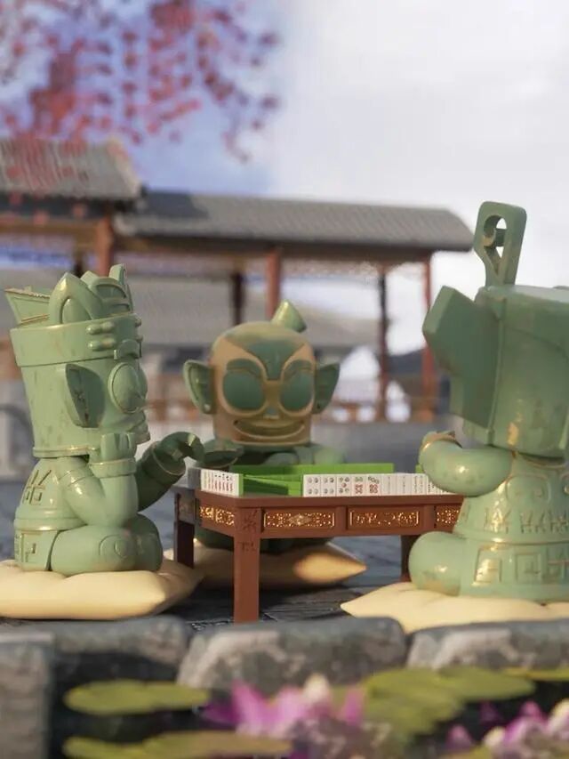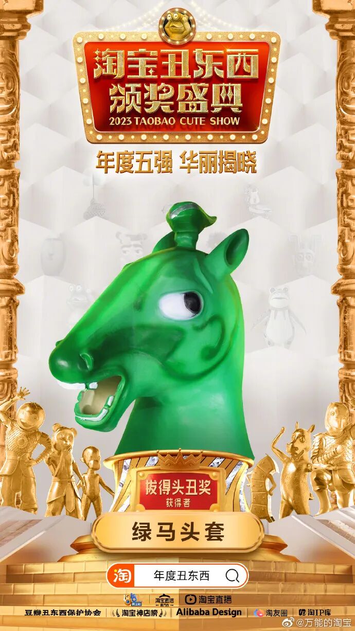 甘肃省博物馆的绿马头套设计灵感源自于文物马踏飞燕,歪头斜眼的喜感造型,和去年爆火的绿头鱼头套有的一拼,凭借侧面英姿矫健,正面缺失脑干的反转气质稳稳胜出,获得拔得头丑奖。在颁奖盛典的舞台上,绿马头套还和往届的绿头鱼、微笑的橘子头套一同上台,三人可以一起组成 “三巨头”出道了。