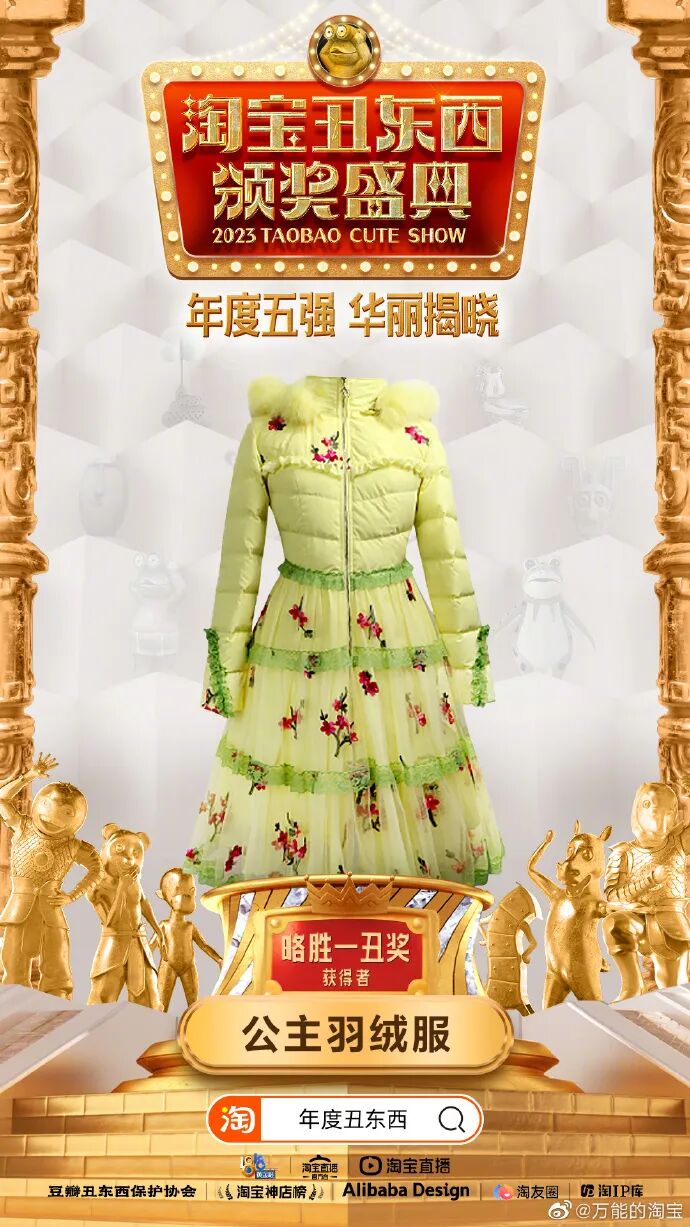 最终,脑花帽、公主羽绒服、人脸粘土手机壳、甘肃省博物馆的绿马头套和青蛙人偶服成功脱颖而出,成为“年度丑东西”。公主羽绒服获得略胜一丑奖,公主羽绒服集温度与风度共存,集棉服与蕾丝于一体,上演“羽绒裙的诱惑”。翠绿色搭配红色梅花,这种奇怪的搭配在冬天显得别具一格,时尚中又带着一丝土气。