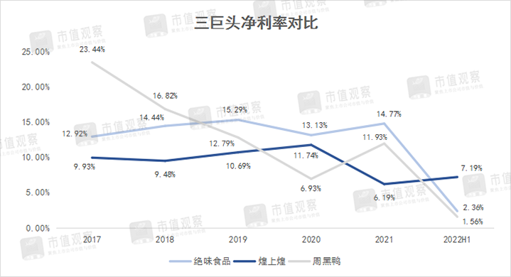 这一点从三家净利率也能看出来。绝味从2019年的15.29%降至2022年中报的2.36%,周黑鸭从12.79%降至1.56%,煌上煌则由10.69%降至7.19%。