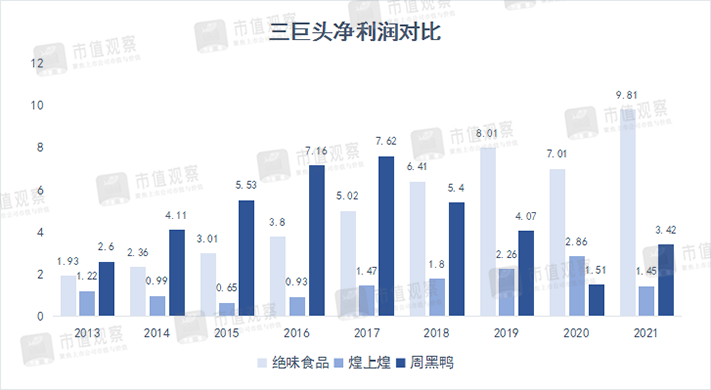 值得一提的是,2021年,当周黑鸭和绝味食品净利润还在高速增长的时候,煌上煌增长已出现乏力,净利润下跌了49%,率先进入寒冬。