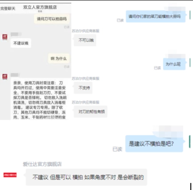 在消费者使用菜刀拍蒜,结果刀身断成两截之后,客服竟然直接称“不建议拍蒜”,这一反常识的论调激起了巨大舆论浪潮。