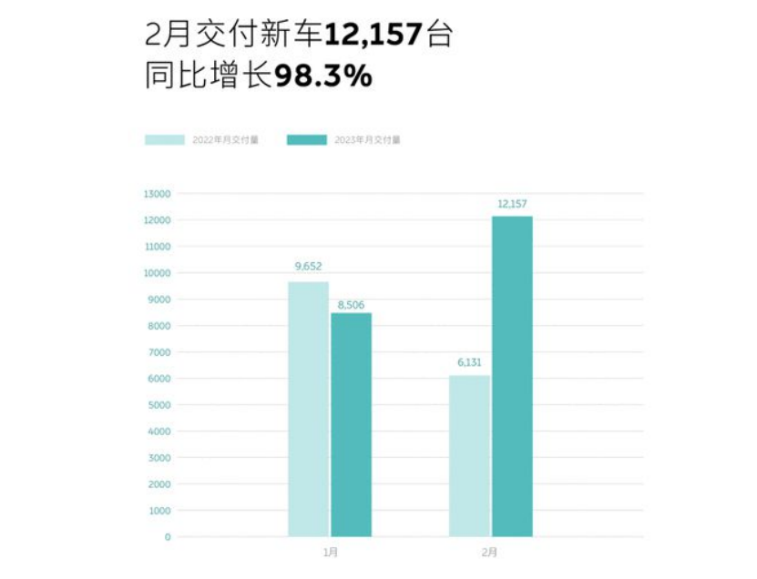 蔚来汽车2月新车的销量成绩为12157台,相较去年同期同比增长98.3%,较上个月环比增长了42.9%。其中新能源电动SUV系列累计交付了5037台,新能源电动轿车则是交付了7120台,自蔚来汽车上市以来目前已经累计交付了310219台。