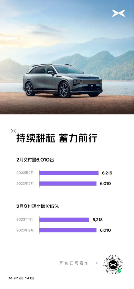 小鹏汽车2023年2月的交付成绩为6010台,同比下降了3.3%,环比增长了15%。