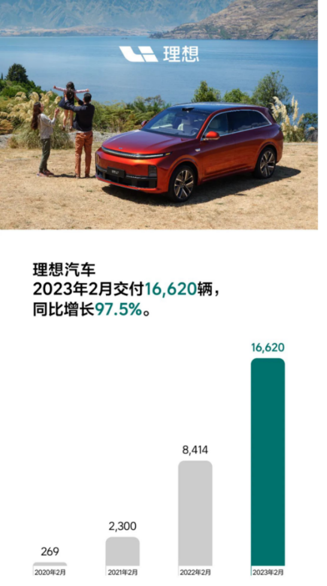 3月1日,理想汽车公布了其2023年2月的交付数据,理想汽车共计交付新车16620辆,同比增长97.5%,环比增长了9.8%。目前2023年前两月理想汽车累计销量为31761辆,距离完成第一季度52000至55000辆的销售目标,至少3月要完成20239辆的销量成绩才能实现。