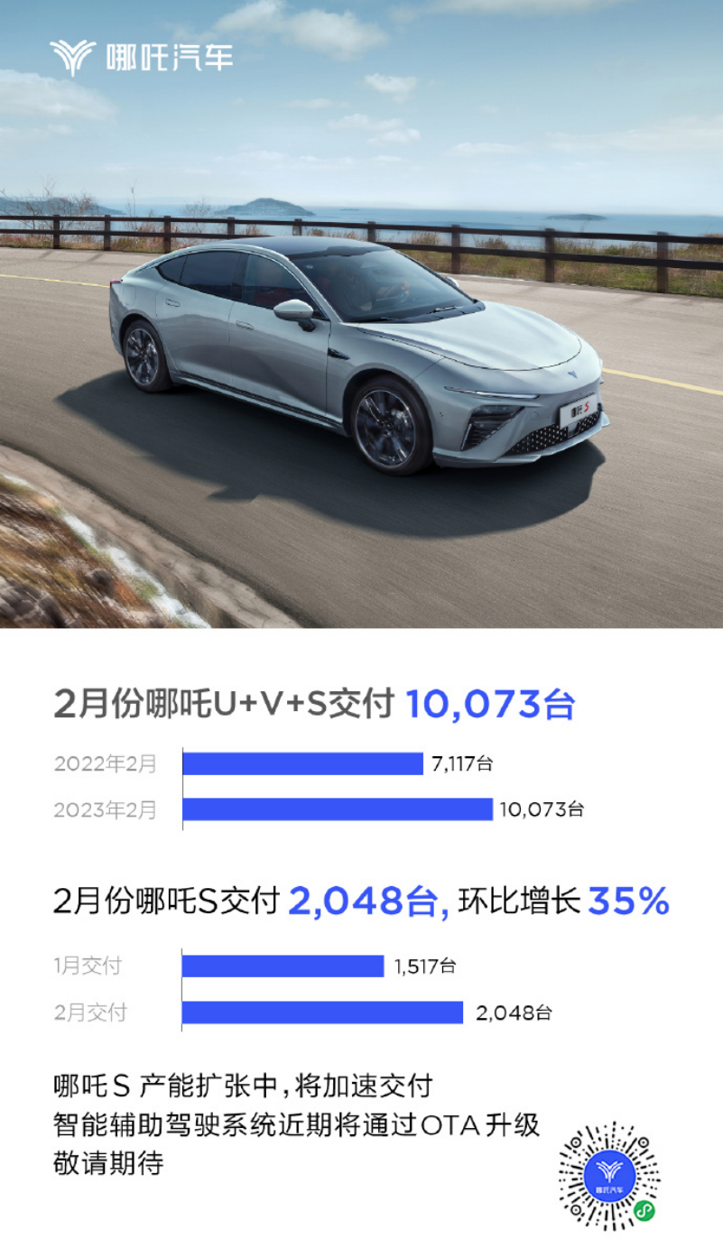 3月1日哪吒汽车公布了2月的销量成绩,为10073台,同比增长了41.5%,环比增长67.4%。其中高端车型哪吒S在2月的销量为2048,环比1月的销量成绩上涨了35%,是哪吒汽车2月销量中的20%。
