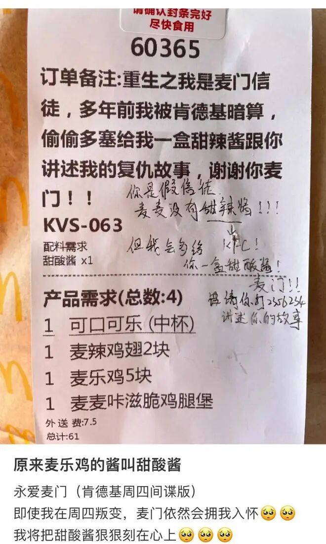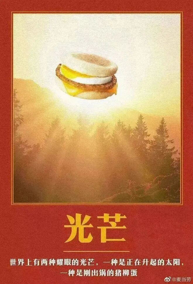 ●图源:截图更神奇的是,信徒们非常真诚,自发为“麦当劳国”改变了一首“国歌”。“麦当劳汉堡,好~好~好~,麦当劳薯条,条~条~条~”一首《麦当劳无限好》唱出粉丝汹涌澎湃的心声。这首歌成为麦门信徒的入门暗号,如果没立马接住下一句,你会被拒之门外。不得不说,被歌曲洗脑后,原版陈奕迅的《夕阳无限好》再难正常听了。麦当劳官方创办了《鸡不可失》表情包大赛,收获有梗有传播点的猫猫emo表情包。甚至推出一波“麦门卡片”,麦当劳经典食物在闪闪发光,配上无脑歌颂、上升价值的彩虹屁文案,将这场狂欢推向新高潮。总之,麦当劳官方敏锐地察觉到粉丝自发的狂热,果断下场参与互动,甚至亲自输出一波有梗好玩的创意设计,将麦门文学推上一个新台阶。对比肯德基“疯四文学”的欧亨利式转折,麦门文学以虔诚的信仰为优势,成功打入互联网阵营。02