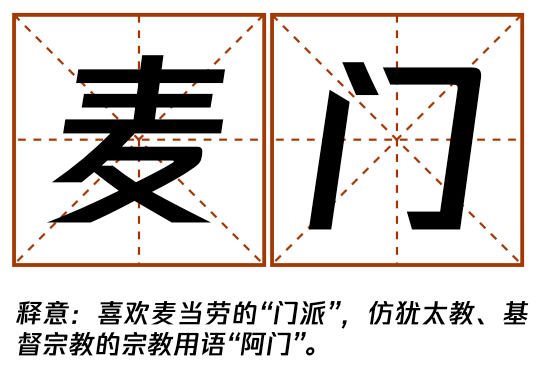麦门全称是“麦门信徒忠实门徒”,模仿基督教和犹太教用语,以“阿门”展示门徒对麦当劳的信仰和喜爱。