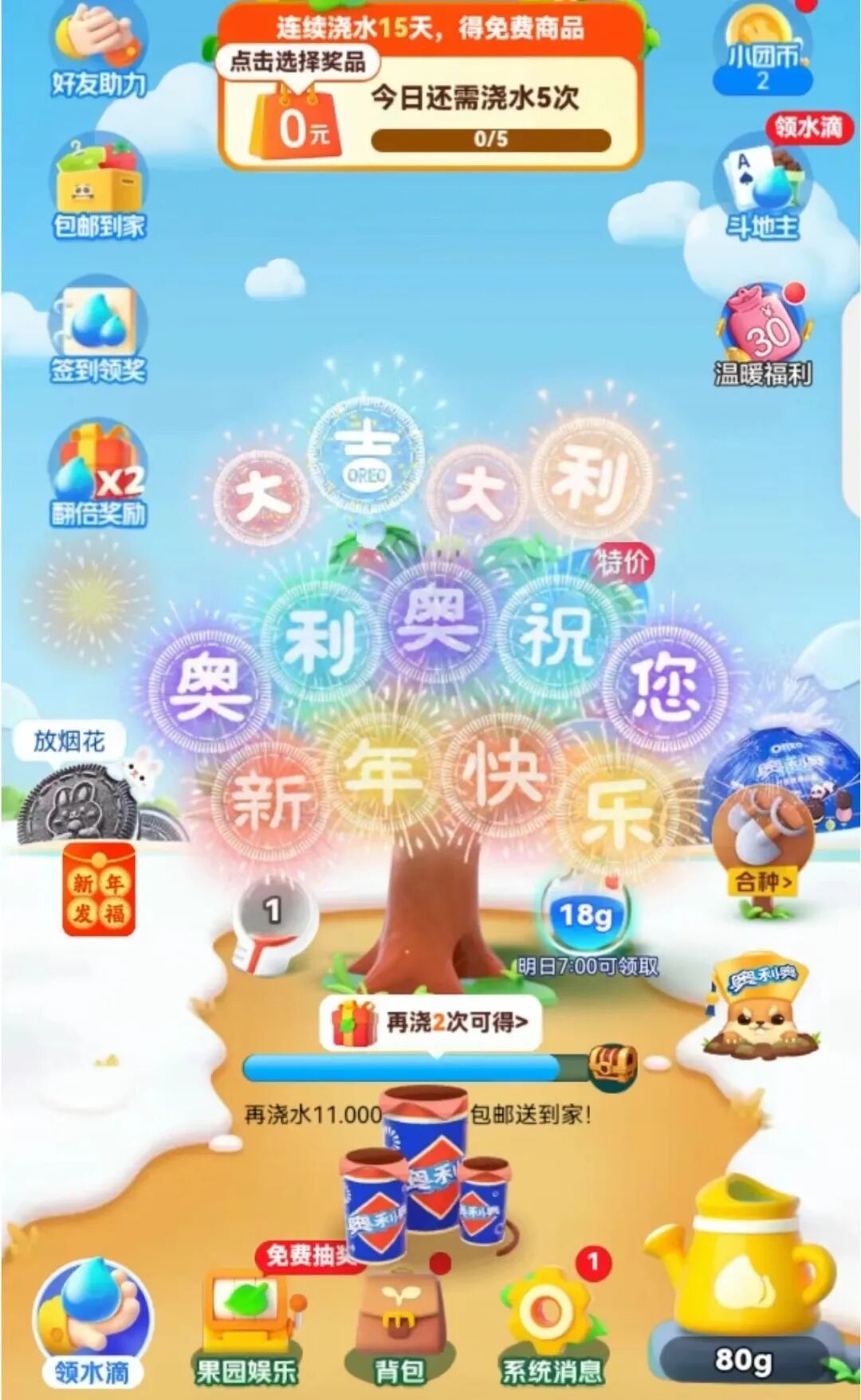 基于此,奥利奥联动小美果园扩展美团平台新的流量入口,通过定制新春皮肤、烟花、果树优惠券的趣味互动形式,传递奥利奥的年味祝福,由此实现精准人群的定向投放,将奥利奥新年活动触达更多人群,提升用户购买欲望促进下单转化。而且配合游戏活动,双方还设计下单奖励游戏道具的形式,将游戏场景和下单场景联动,促成良性的消费转化。