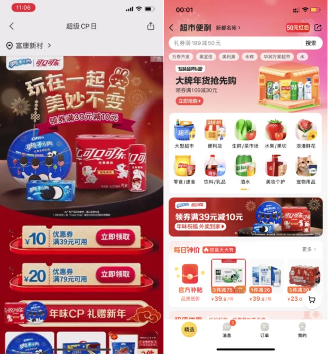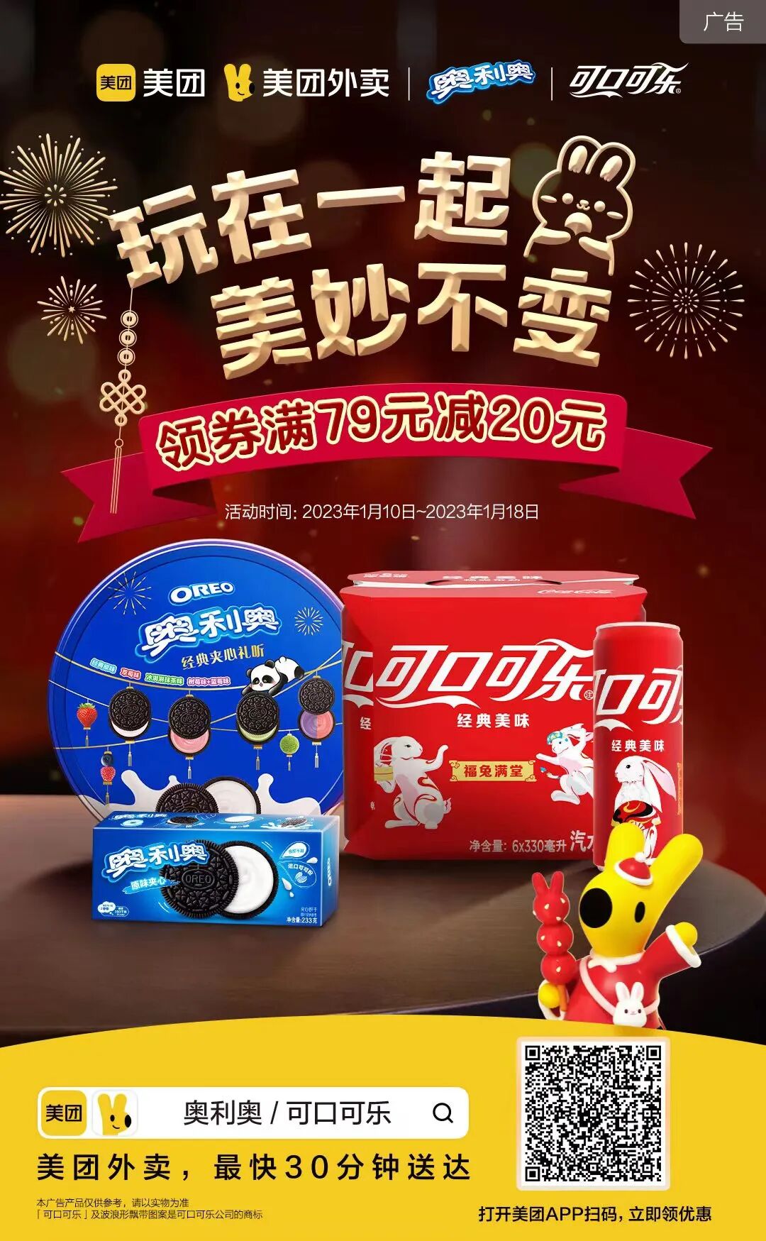 在这样的模型驱动下,奥利奥收获预计超4.5亿次的活动曝光量,美团活动期GMV年同比增长超休闲食品大盘增长将近1倍,日均交易用户数年同比增长35%;此外,奥利奥还联动可口可乐组CP进行情感升华,将福利消费与情感消费合二为一,使得奥利奥的CNY营销价值得到充分释放。
