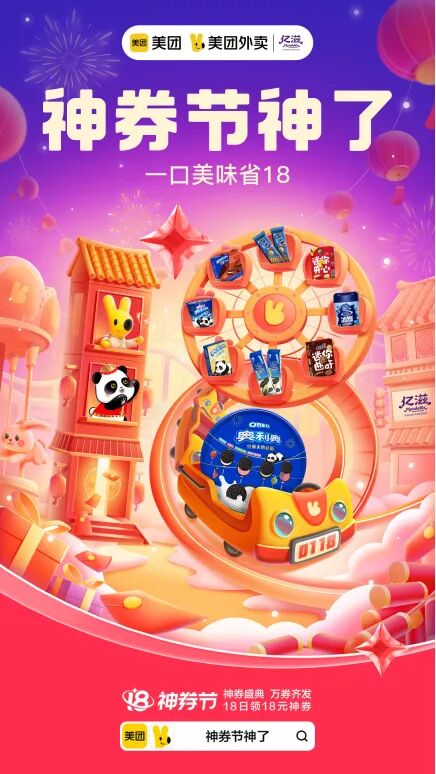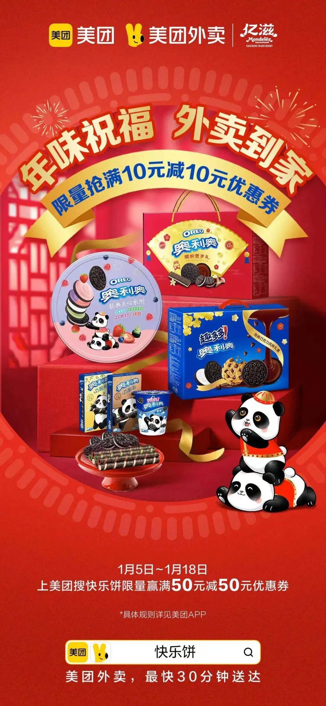 基于此具体来看在美团侧,奥利奥x闪购发起心动大牌日,通过盘活美团闪购站内全方位资源——站内天降、主站中通、banner、搜索词等优势营销资源,为奥利奥“年味祝福外卖到家”活动增加曝光量。