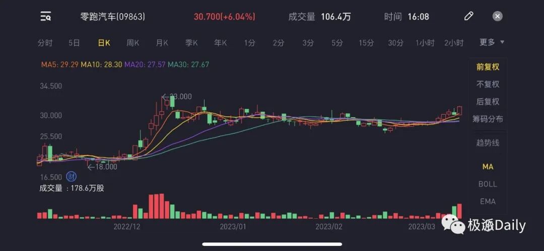 2022年9月29日,零跑赴港上市,首日即破发。截止2023年3月3日港股收盘,零跑报收30.70港元/股,总市值350.8亿港元,近250天跌幅为29.39%。