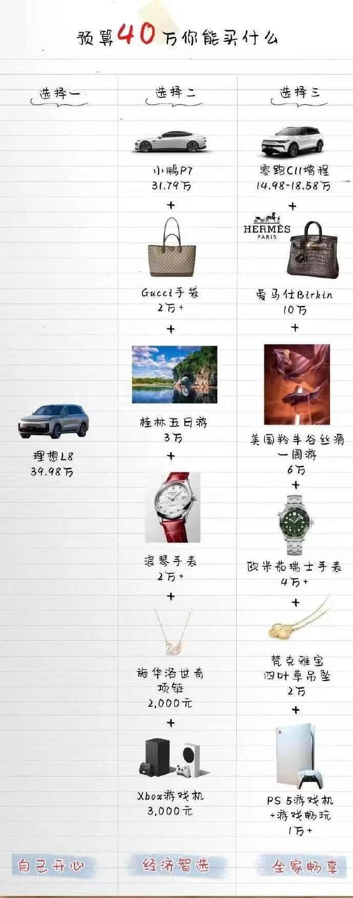 也有人在微博上用C11增程“碰瓷”理想L8,称“一辆理想L8=一辆零跑C11增程+爱马仕Birkin+美国羚羊谷丝滑一周游+欧米伽瑞士手表+梵克雅宝四叶草吊坠+PS 5游戏机+游戏畅玩。”