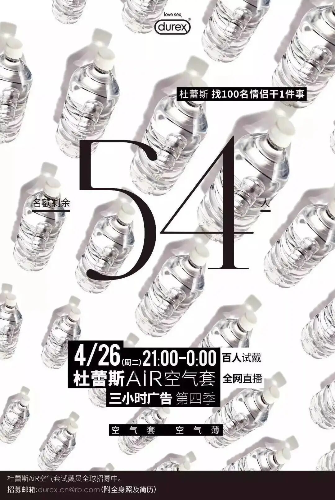 早在2016年,直播崛起的元年,杜蕾斯就策划过一场直播大事件——“百人试套”,当时还发布了招募情侣的宣传海报。