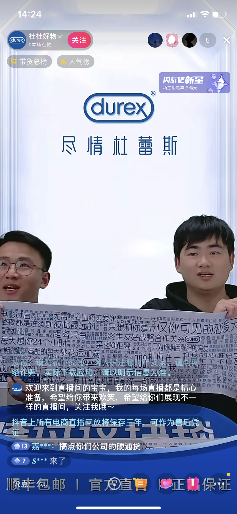 近日,有网友发现杜蕾斯开通了直播间“杜杜好物”。