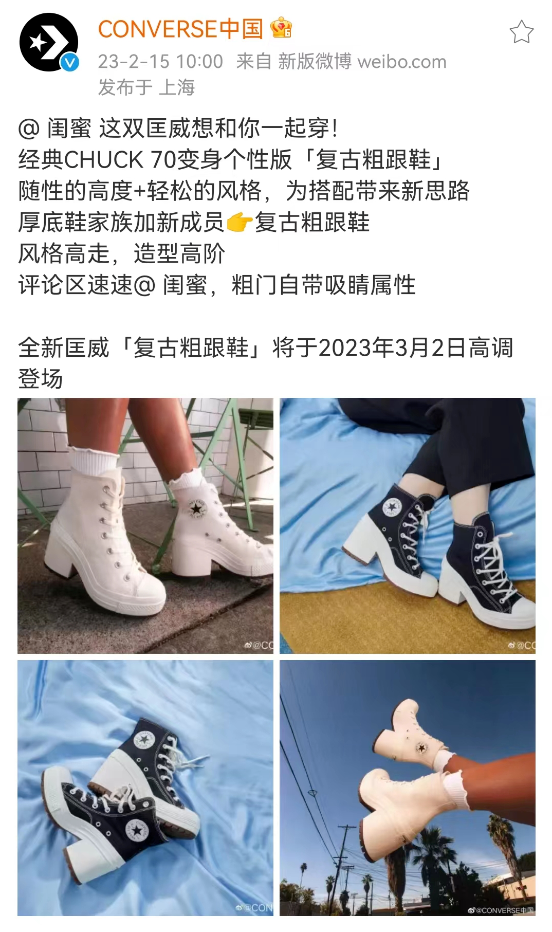 归根结底,其最大的意义就是通过“造话题”来传播品牌或产品。通常好的话题能瞬间引爆网络,短时间内让品牌获得大量流量,引发关注和讨论。新奇的是,匡威也上线了一双意料之外但又在情理之中的高跟鞋款,很好地造了一波话题。