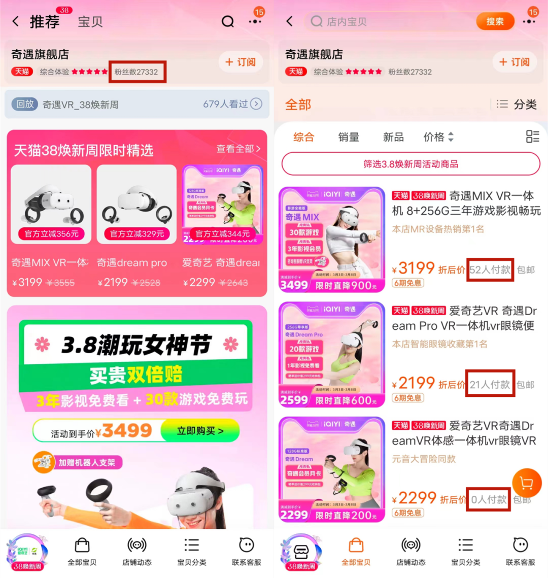 显然,策略有效,但在销量上的体现恐怕不多。据微果酱观察,尽管打出了“3年影视免费看+30款游戏免费玩”的女神节营销广告,但销量最高的产品也才堪堪显示52人付款。
