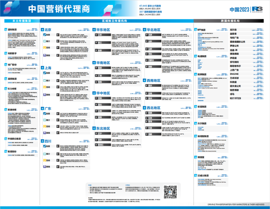 持续的新冠疫情重塑了中国的代理商生态系统,代理商数量减少,同时收益也相应收到影响。独立营销咨询公司胜三( R3 )的2023《中国广告代理商图谱》将代理公司分为三类(本土传播集团、区域独立传播集团、跨国传播机构),并归纳出: