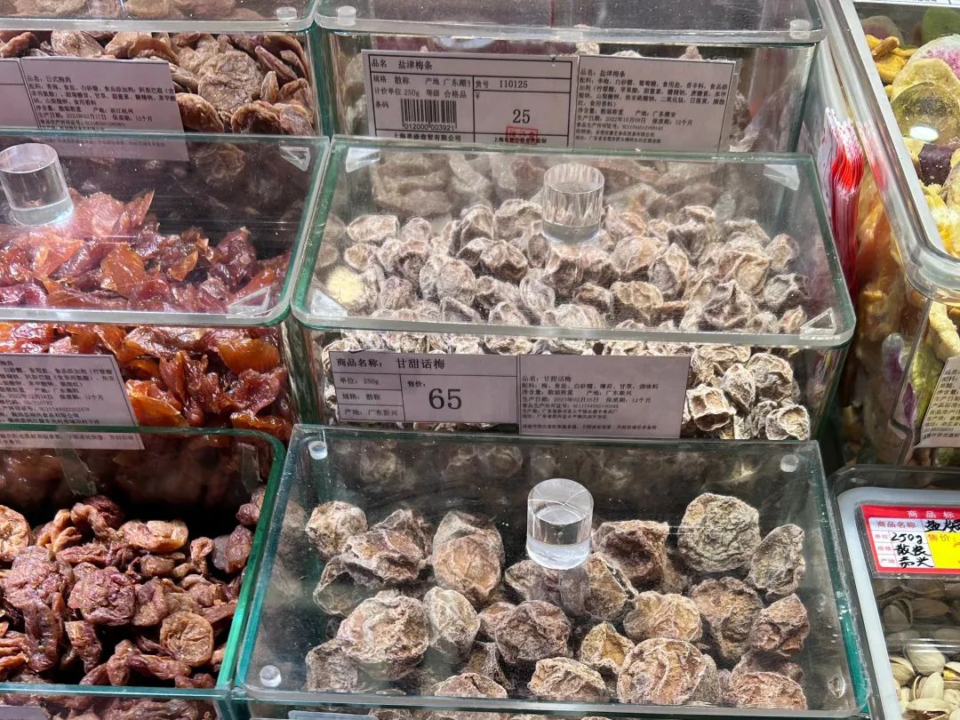 惊蛰研究所走访发现,被网友称为“刺客”的店铺,大部分位于商业广场或购物中心,以独立店面和开放柜台为主。这些店铺大都是用透明的容器装盛着各种散装零食,其中以话梅类果脯蜜饯和糖果为主,容器的外壁贴着相应食品的价格标签。