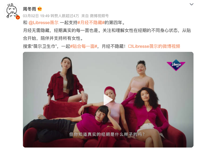 聚合热点:广告片发布当天,Libresse薇尔携手代言人周冬雨共同宣发,抢占流量高地。关注和理解女性在经期的不同身心状态,一起支持“月经不隐藏”。