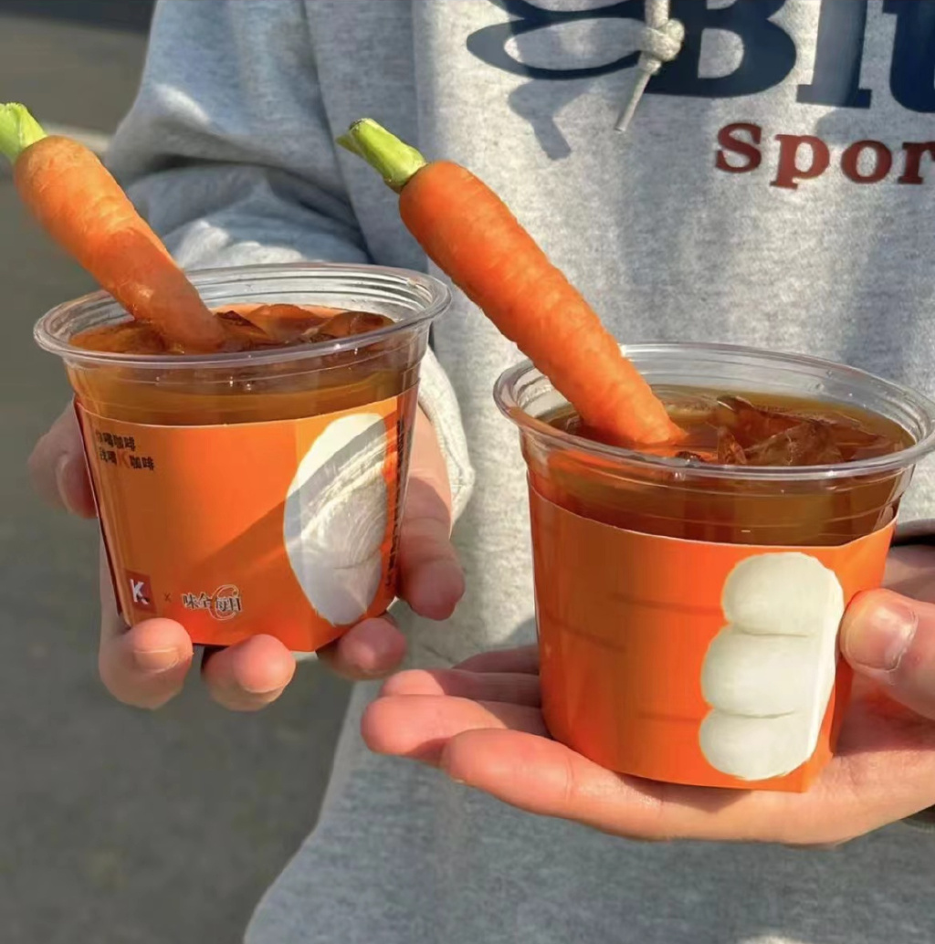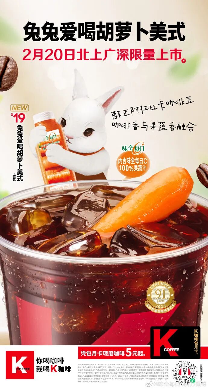 上个月,肯德基联合味全推出首款果蔬咖啡「兔兔爱喝胡萝卜美式」,特意注明北上广深限量上市,确定这么有创意的产品不让其他地区的小伙伴也尝尝?在美式的基础上加入100%胡萝卜汁,再点缀一根小胡萝卜,配上萌兔杯套和胡萝卜立体手提套,一整套下来齐活了,不能打也能看。