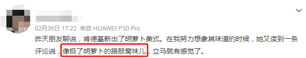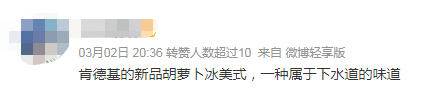 尝鲜过后,网友从不吝啬分享自己的感受,附上各种脑洞大开的形容词汇,谁看了都忍不住想要立刻买一杯胡萝卜美式,验证一下。有说“不是食物该有的味道”,有说“烟灰缸兑水放到发酸的味道”“。有说“混匀了像泥巴水”,更有离谱的说“属于下水道的味道”。还有生动又极具想象力的表达“像极了胡萝卜的胳肢窝味儿”。难以想象的组合,搭配具象的形容,按捺不住这该死的好奇心,已经走在赶往肯德基的路上…口味这回事只有自己尝了才知道合不合适,有人说这是自己喝过最难喝的咖啡,表示“喝了一口脸部表情瞬间扭曲”。与此相对的是觉得味道还不错,甚至有人认为好喝,要跟胡萝卜美式锁死。