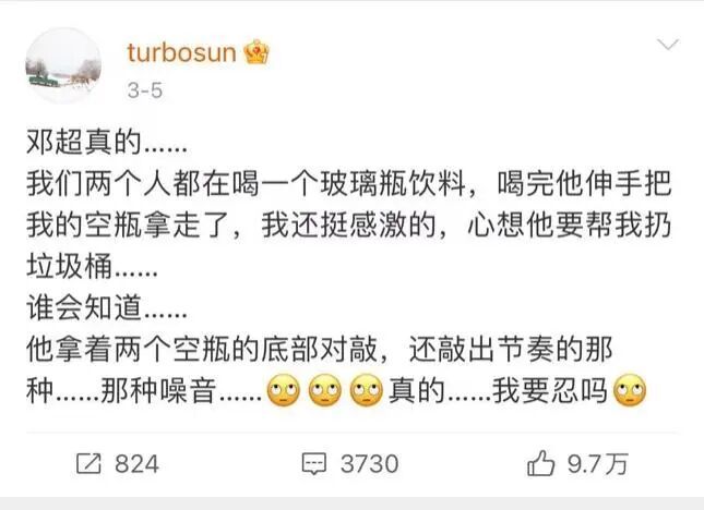 点进孙俪微博其实这事初见端倪。早在3月5日,她发文吐槽邓超的搞怪日常,大概总结下就是:超哥放飞自我,拎着空瓶打节奏;俪姐不堪其扰,奔向微博倒苦水。