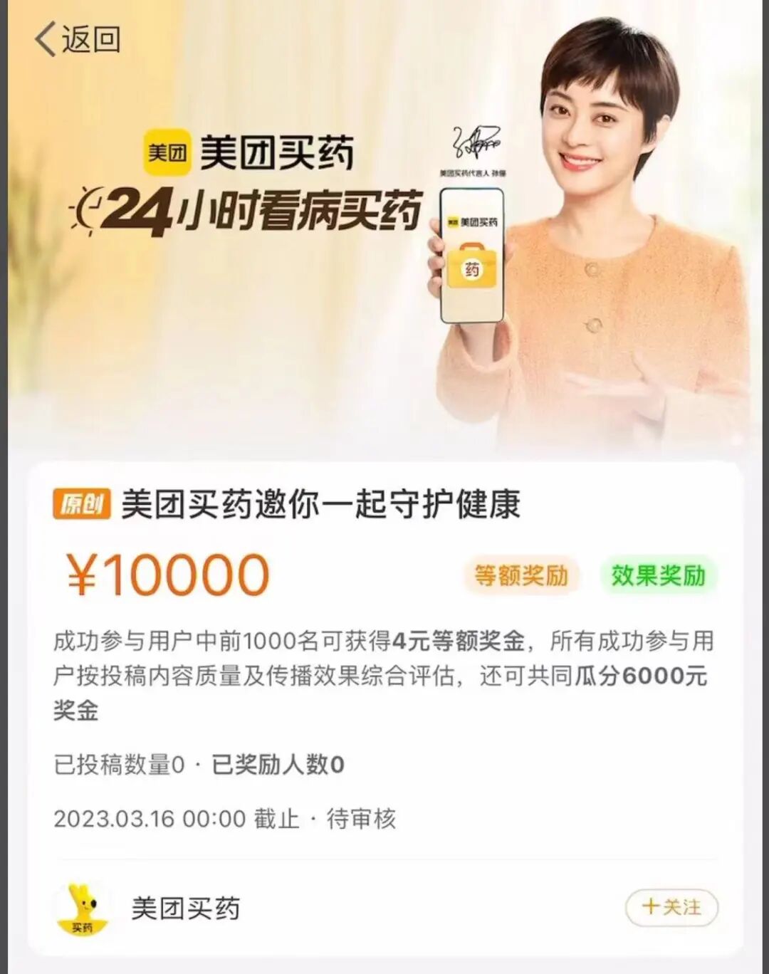 再看星选任务。美团买药围绕“邀你一起守护健康”的话题,成功发起了一轮任务互动。用户能采取多种创作形式,在投稿文案里添加#孙俪代言美团买药#的话题且@美团买药,参与成功即可获得奖金。