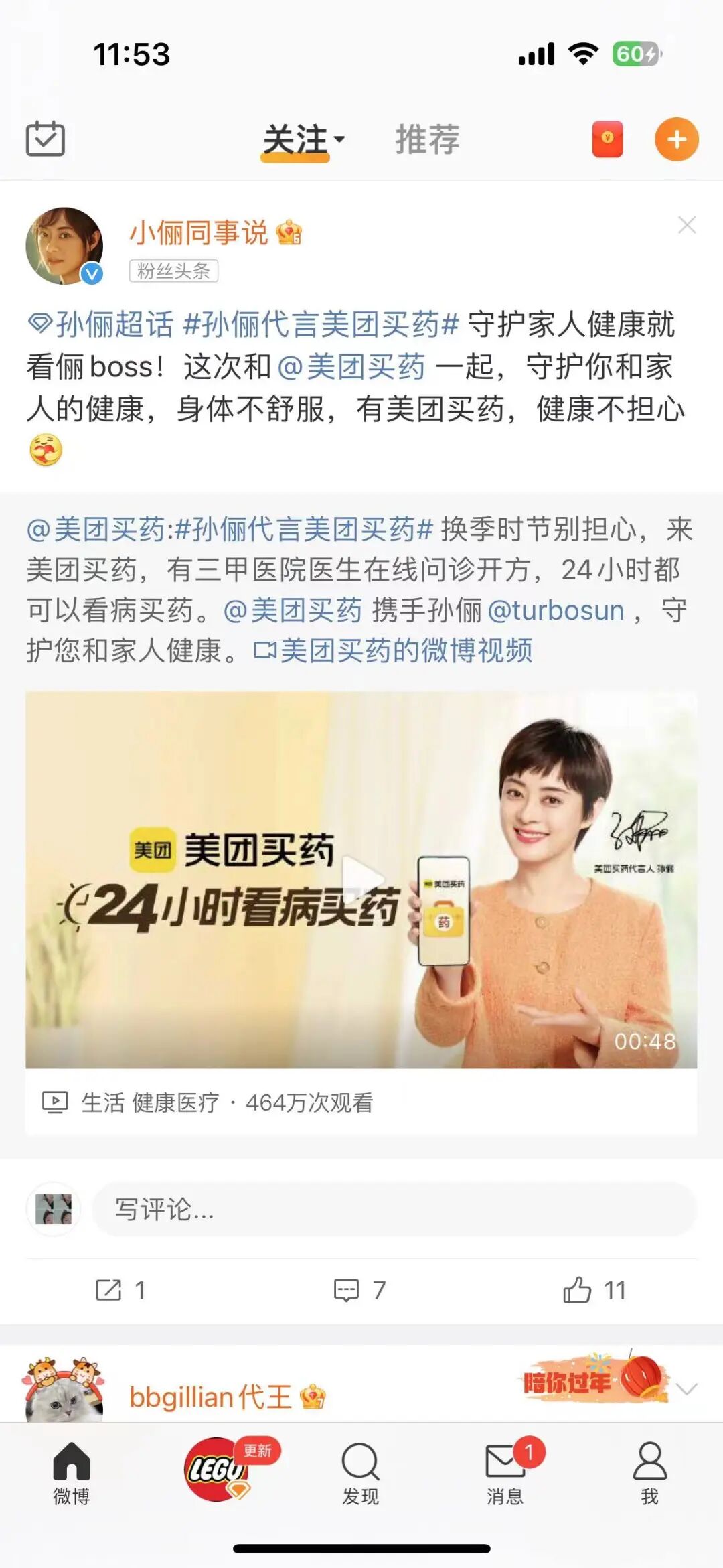 微博还利用相应资源搭建起两条链路,一条会跳转至#孙俪代言美团买药#的热搜话题,页面下滑便能看到孙俪的微博和超话,另一条则可以直达美团买药的相关活动页。从引流到转化,这样更有利于品牌资产的沉淀。
