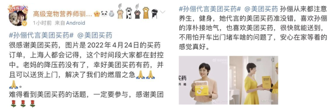 很显然,这些正向评价对美团买药、孙俪都有价值加成,也进一步助推着此次合作破圈扩圈。