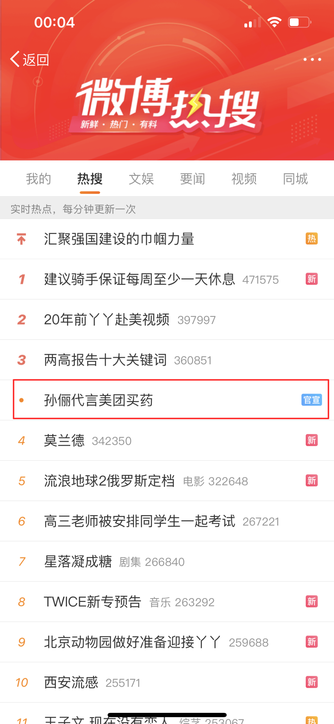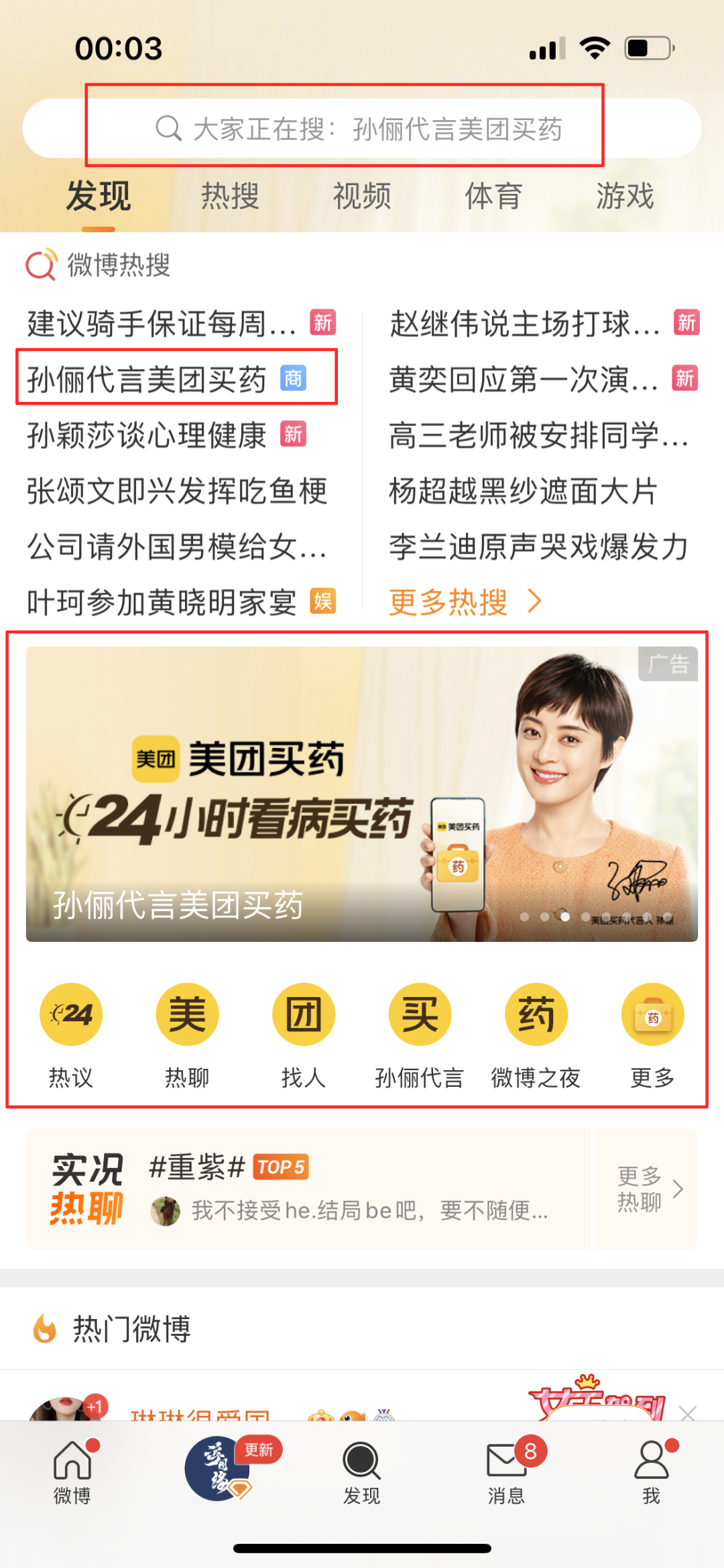 如果你在3月9日打开微博,会发现哪哪儿都是美团买药和孙俪的代言合作。发现页背景海报、热搜话题、热点大视窗,搭配品牌向标识,这种打造出的沉浸式气氛,真的让人很难忽略。