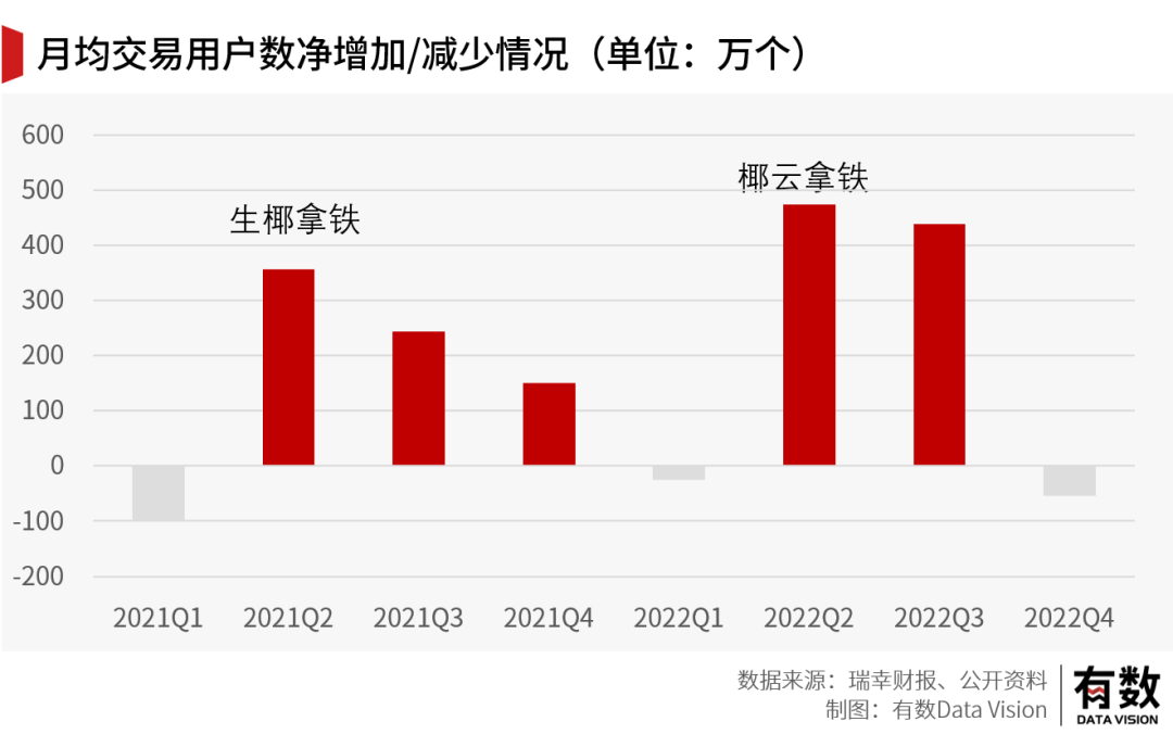 2021年二季度,瑞幸推出生椰拿铁,此后四个季度,其月均交易用户数的边际变化情况为:+356万,+244万,+151万,-25万;2022年二季度,瑞幸的椰云拿铁成功接棒,其月均交易用户数的边际变化情况为,+474万,+439万,-54万。