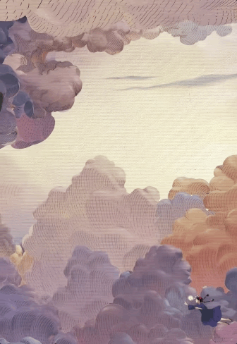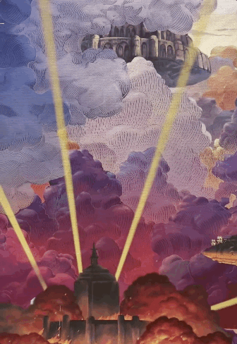 紧接着,画面镜头拉远,天空之城拉普达的神秘全貌渐渐浮现。从近至远的环形视角切换轨迹,象征着巴鲁和希达踏上的冒险旅程。