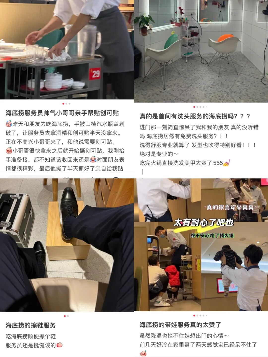 众所周知,海底捞一直标榜的就是顾客高于一切的服务理念,推出了无数贴心服务:帮下菜倒饮料、无限量零食、免费美甲、生日祝福、擦鞋、洗头、帮带娃等等。