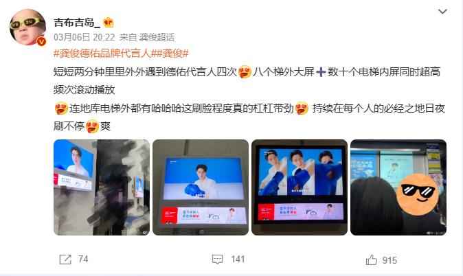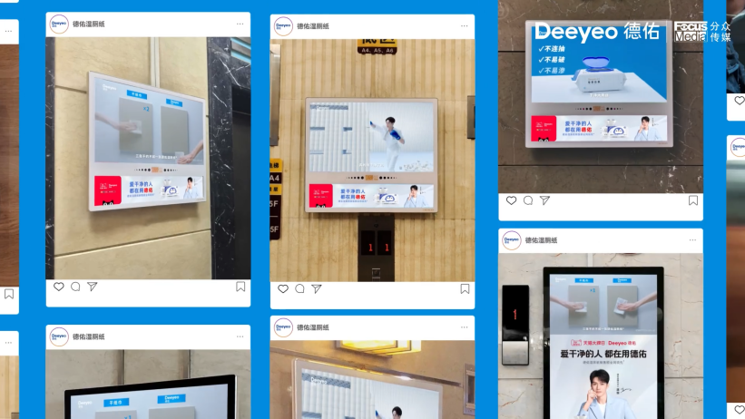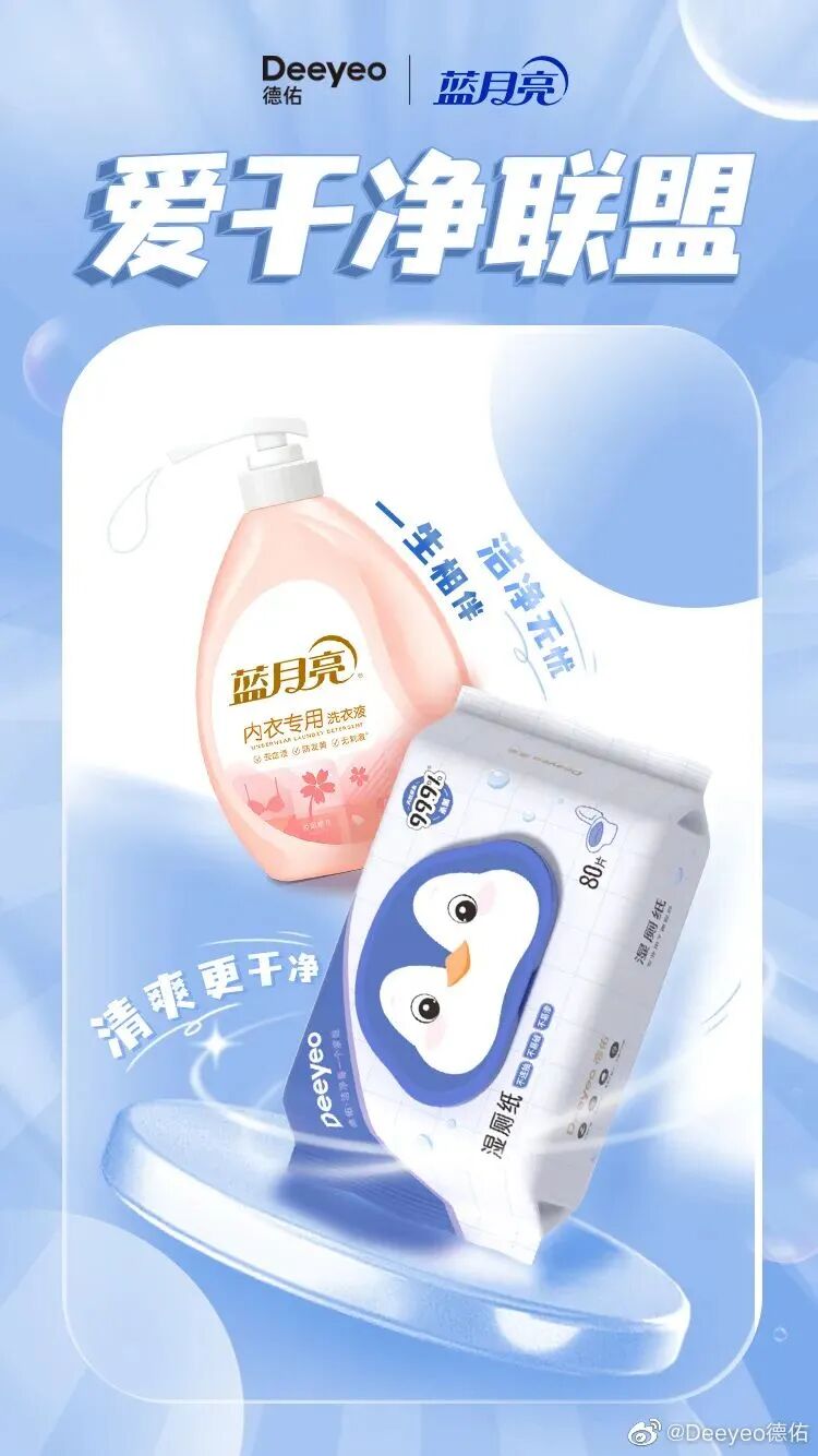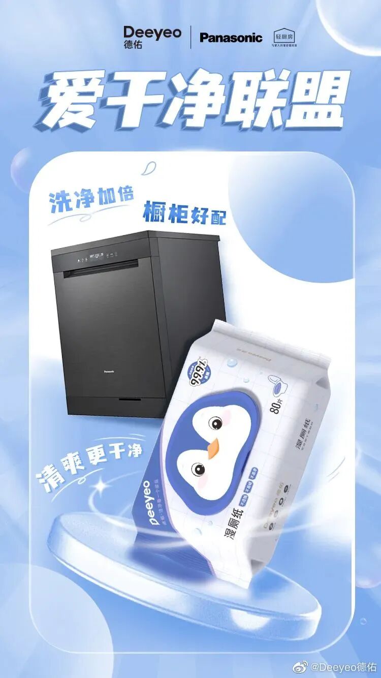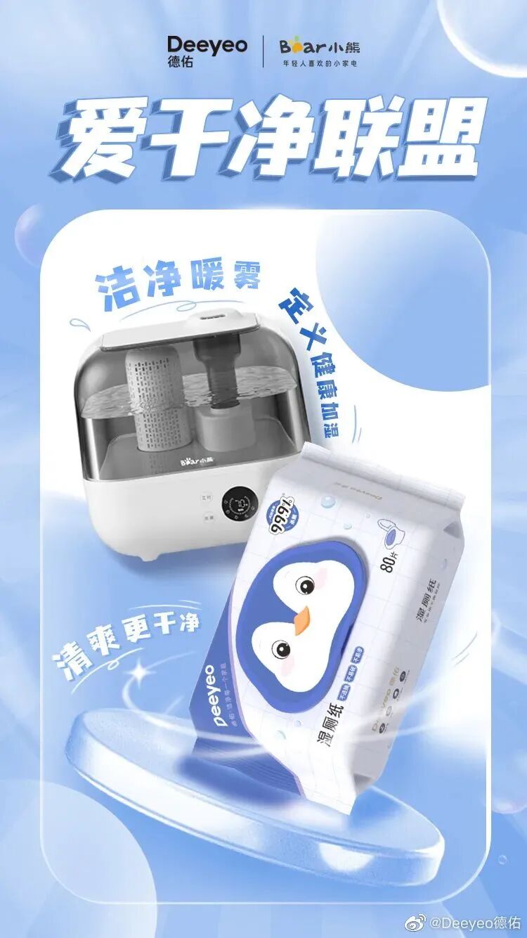 其次,一波梯媒刷屏,在生活场景中巩固“干净”认知。为了延展出更大的传播价值,在TVC之外,Deeyeo德佑在投放渠道上下足了功夫,在全国多个城市电梯、线下大屏进行广告投放,全面包围覆盖消费者出行路径。在这些人流量极大的线下场所,广告片统一的视觉画风形成了强势的吸睛力,实现消费者“干净”入口的全面占位。广告上线之处无不吸引了大量消费者驻足观看,通过与目标消费群体进行了密切接触,精准解锁了粉丝注意力。值得一提的是,借力龚俊的明星势能,这波线下投放在粉丝群体中引发了一波讨论热情,不好粉丝通过线上分享,让这次线下投放产生了社交货币效应,带动了一波线上线下的联动传播。最后,一次节点联动,让“干净生活”从主张到落实到行动。当然,线下火热之外,线上同样热闹非凡。为了让此次品牌焕新拥有更长的传播链条,Deeyeo德佑还巧妙借势38节点,联动@蓝月亮 @松下轻厨房 @恒洁HEGII @小熊电器 @361度官方旗舰店五大蓝V品牌组成“爱干净联盟”,共同倡导“干净生活”新主张。可以看到,在联动品牌的选择上,Deeyeo德佑紧紧围绕“干净舒适生活”的价值属性,不仅高度切合了Deeyeo德佑的品牌属性,更通过这些几乎触及到消费者日常生活的方方面面的品牌打破单一品牌的圈层壁垒,扩大了传播圈层,最大化聚合品牌声量。与此同时,在营销转化上,德佑品牌也是下足了功夫,同时联动“天猫大牌日、天猫超市大牌狂欢”两大电商IP,打通了品效合一的路径。最终,凭借“镇店爆款”湿厕纸火速突围,实现了从营到销的顺利转化,让更多“爱干净”的人都能用上Deeyeo德佑。03