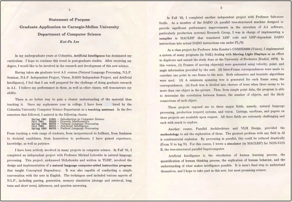 李开复正式进入AI领域是40年前。那时,22岁的李开复正在申请CMU(卡内基梅隆大学)的博士。他在申请书中写到:AI 是对人类学习历程的阐释,对人类思维过程的量化,对人类行为的澄清,以及对人类智能的理解。