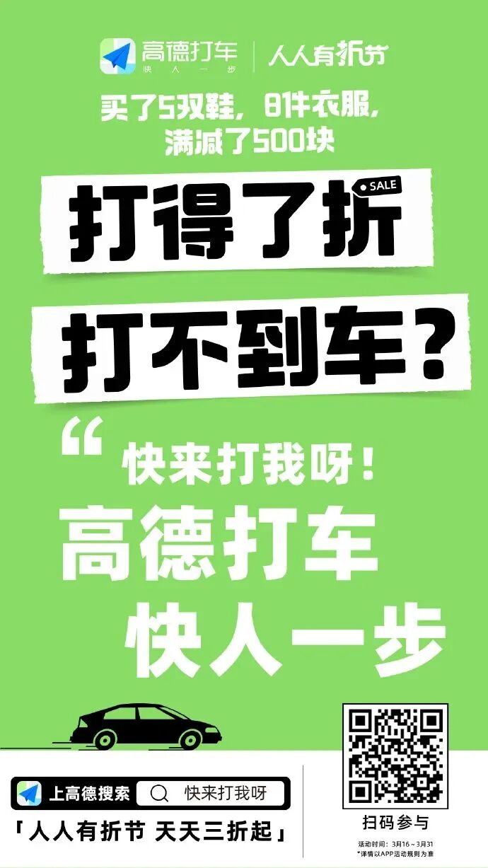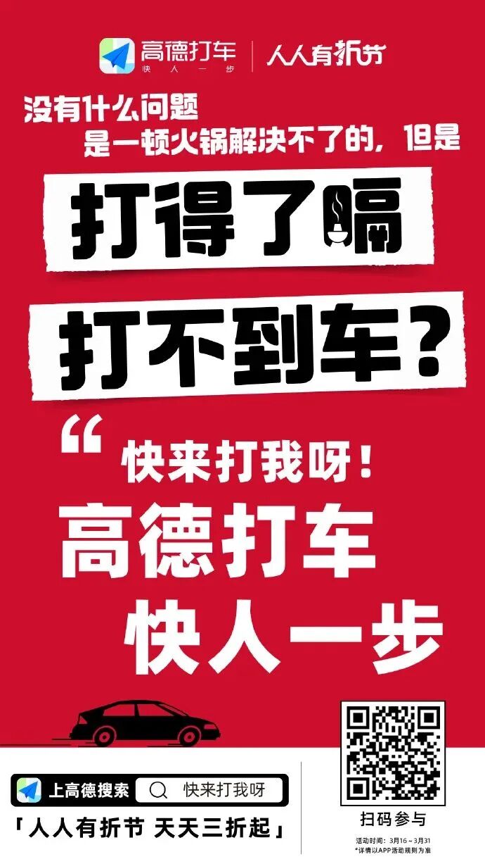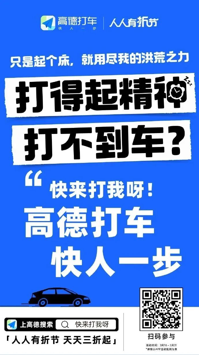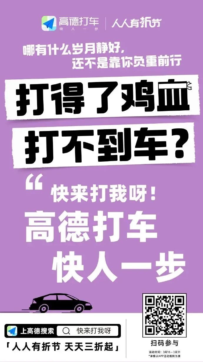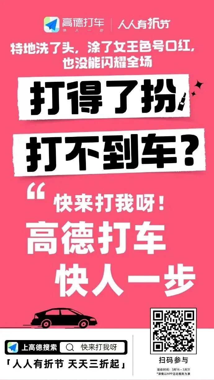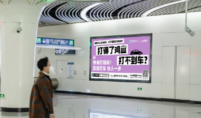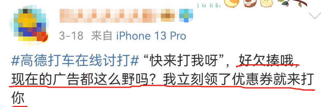 很多人受好奇心的驱使,点进去想一探究竟:高德到底在玩什么把戏。结果才发现,这是高德打车新出的广告。事情是这样的,高德打车近期推出「人人有折节」活动,给用户发放了大量的打车优惠。为吸引更多的用户参与这个活动,高德打车上线了系列魔性小短片,希望大家打不到车时就使劲打它。高德打车洞察到用户早起通勤、加班回家、购物血拼等生活工作场景中“打不到车”而“气得想打人”的痛点,围绕“打”这一核心元素、动作,诙谐地将打车拟化为打人,不仅能帮助用户合理发泄情绪,还巧妙嫁接了自家的“打车”业务,让平平无奇的打车一事成为了脑洞大开的出圈创意。因此,即便是被高德打车套路了,但网友们依旧愿意为沙雕、鬼畜、反差的画风与创意点赞;高德打车在线讨打的做法很快激发了网友互动热情。网友:第一次听别人提这么“贱”的要求,等着,我领完优惠券就来打你。毫不夸张的说,高德打车“讨打”系列广告成为今年入春以来最成功的广告案例之一。不仅如此,高德打车还发布了同款主题海报,将「欠打风」进行到底。与线上刷屏相得益彰的是,高德打车还将“讨打行为”延伸到了线下,在全国多地的地铁、机场、商场、写字楼梯媒等场景,进行地毯式的广告投放,实实在在地让全国人民都知道高德打车有多“欠打”