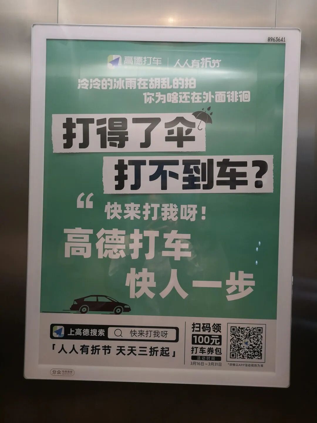 就连小编所在的写字楼电梯间,也没能逃过高德打车的“讨打”广告。