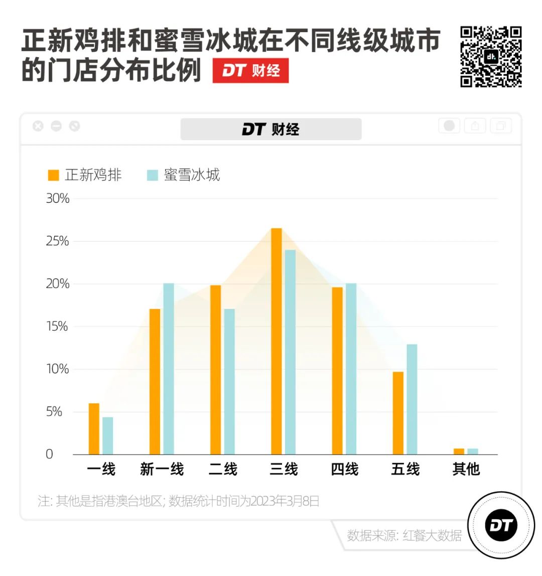 根据红餐大数据,正新鸡排和蜜雪冰城在不同线级的门店比例相差不大——主要集中在三线城市和四线城市。