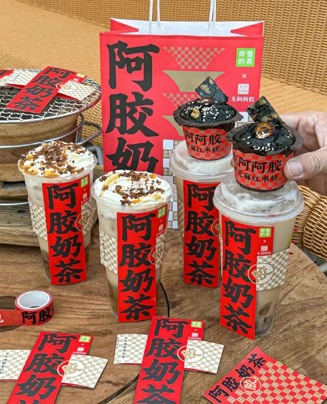 还有前段时间,“奈雪的茶”推出了一系列养生新品——“阿胶宝藏茶”“阿胶奶茶”。
