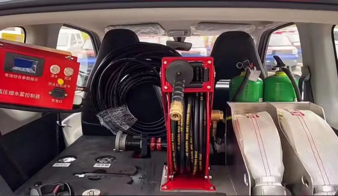 别看这消防车很小,但麻雀虽小,五脏俱全,消防版的后座配备了各种消防工具。