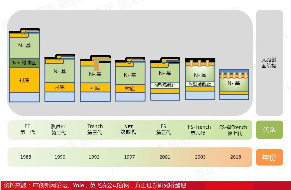 1988年,IGBT第一代诞生,之后从平面穿通型迭代至微沟槽场截止型,整整发展了七代,按照以往的经验每一次迭代,需要耗时5年以上才能占领50%左右的市场份额。