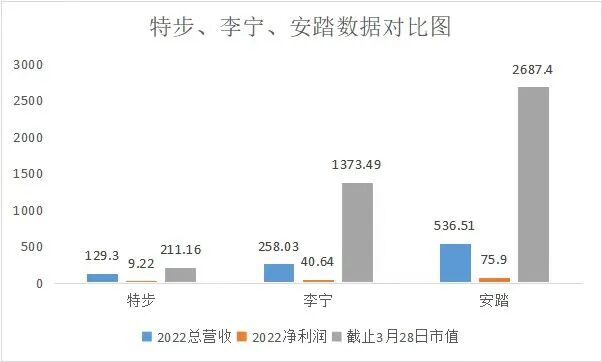 特步大品牌策略驱动下,当主营业务收入仅靠主力品牌支撑,特步的营业收入、利润、市值的来源就会被局限在此。据李宁、安踏2022年财报显示,总营业收入分别实现258.03亿元、536.51亿元,净利润分别实现40.64亿元、75.9亿元,市值截至3月28日特步、李宁、安踏分别为211.16亿元、1373.49亿元、2687.40亿元,特步与之体量对比还存在较大差距。
