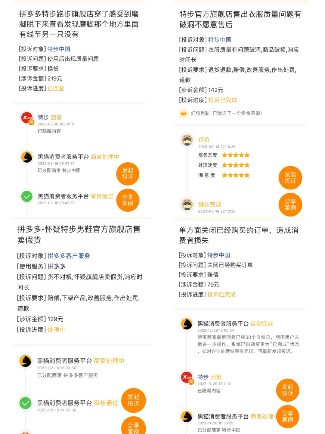在黑猫投诉上,搜索关键词“特步”“质量”共出现181条结果,均为质量堪忧的投诉。而在拼多多平台购买的特步产品,还涉及到对于售假、服务体验等方面的不满。