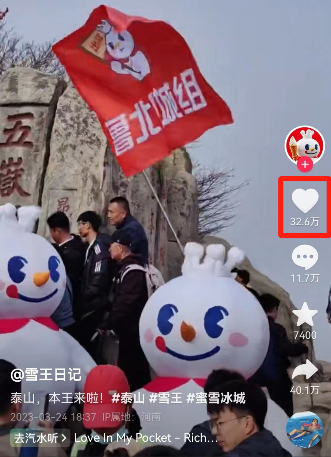 登顶泰山是雪王又一次成功的营销,用只贵一块的价格杀上了泰山顶峰,让消费者惊喜的同时,给品牌又刷了一波热度和好感。